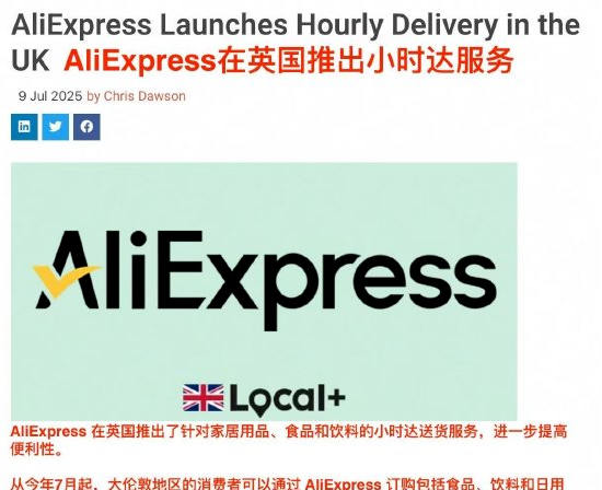 7月10日消息,据英国媒体报道,阿里旗下的跨境电商平台速卖通AliExpress,本月起在英国推出“小时达”外卖服务。