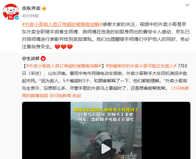 7月10日,京东外卖官方今日发文表示,对于此前在山东济南暴雨中救人的全职骑手苗春生师傅,已进行表彰并给到奖励津贴。
