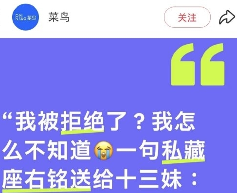 近期,苏超新一轮比赛启动。。网传菜鸟想赞助常州队但被拒绝,对此,今日,菜鸟官方在社交媒体发文称:“我被拒绝了?我怎么不知道。一句私藏座右铭送给十三妹:秉持菜鸟之心,超越鸿鹄之志。常州队加油!”