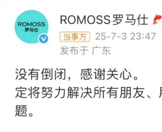 7月4日消息,罗马仕将全面停工停产被误认为是即将倒闭,昨晚罗马仕发布公告回应称,“没有倒闭,感谢关心。定将努力解决所有朋友、用户及合作伙伴的一切问题”。