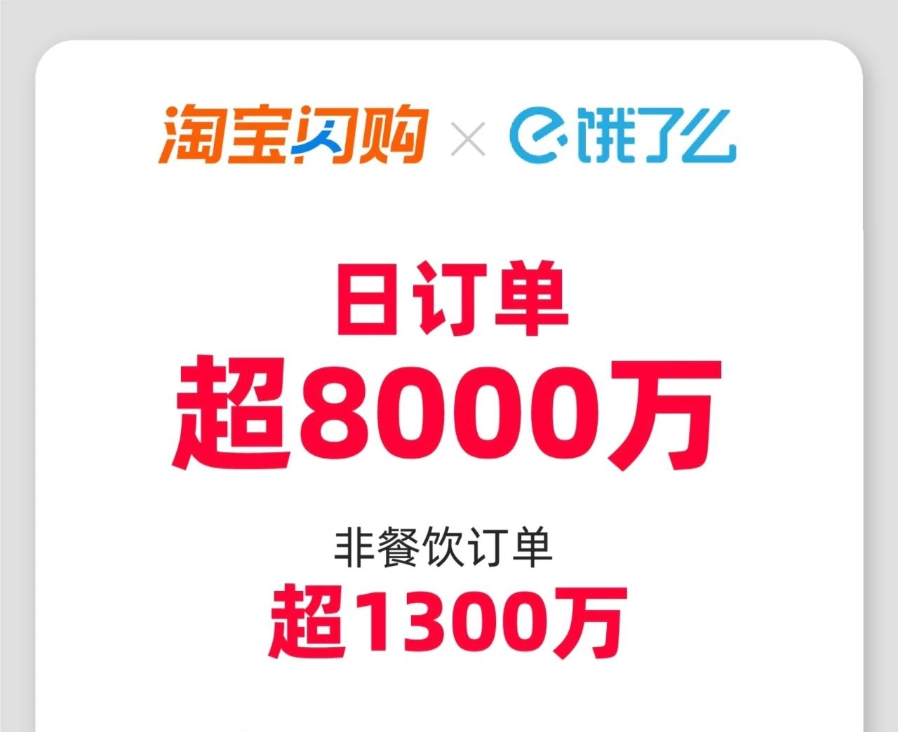 淘宝闪购与饿了么今日联合宣布平台日订单总量突破8000万大关,非餐饮类订单强势攀升至1300万以上,日活跃用户规模超2亿。