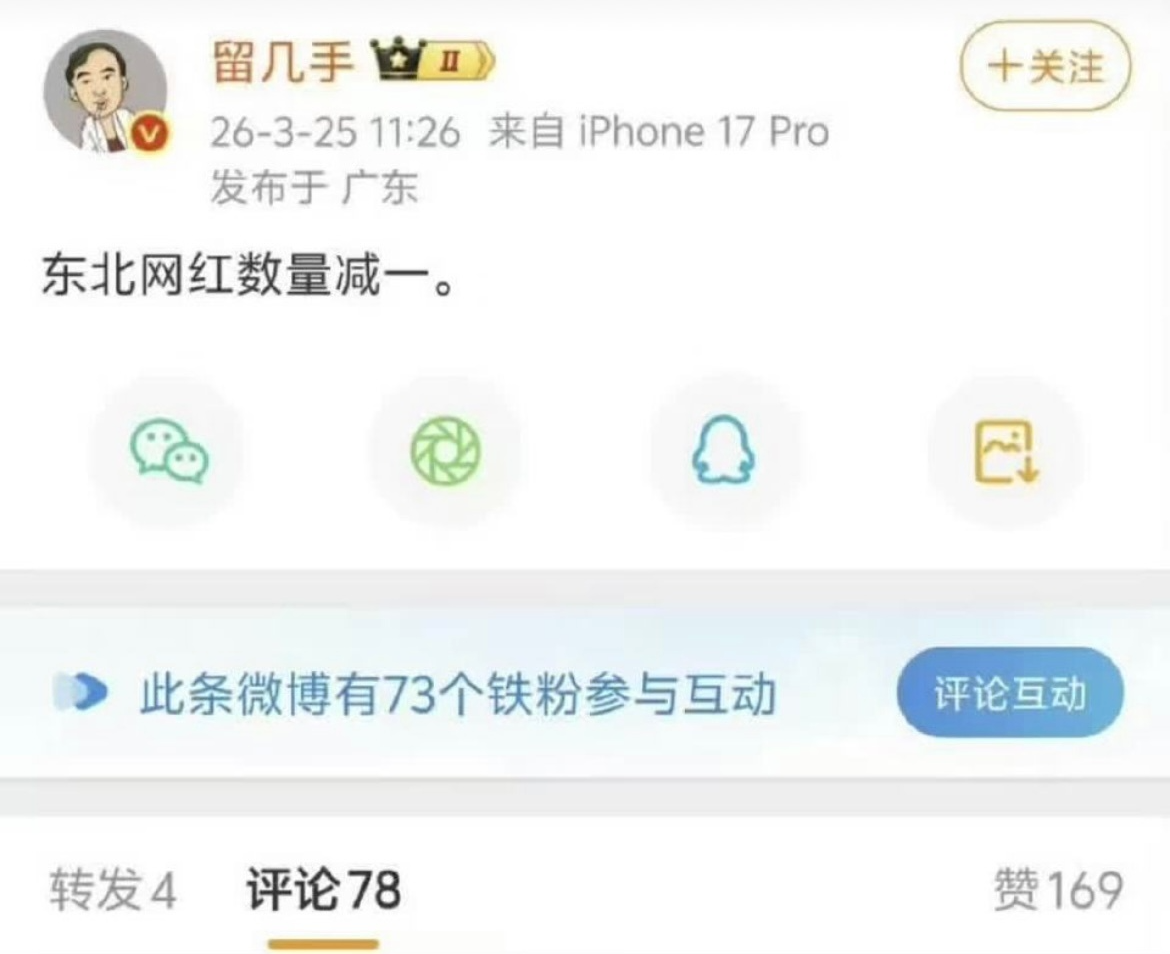PChome 3月27日消息,近日,网红留几手在微博发文“东北网红数量减一”,被网友解读为影射前一日因心源性猝死离世的教育领域名人张雪峰。