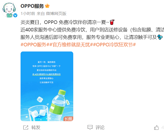 6月26日消息,今日OPPO服务官方微博宣布推出夏日清凉活动,7月至9月期间,用户前往全国近400家指定服务中心送修设备(包括贴膜、清洁保养等),即可免费领取冷饮。