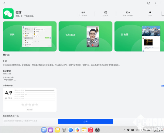 6月26日消息,微信员工客村小蒋介绍,鸿蒙电脑版微信今天正式上架华为应用市场,目前安装量已突破1万次。据了解,微信鸿蒙版已支持聊天、朋友圈、小程序等全功能