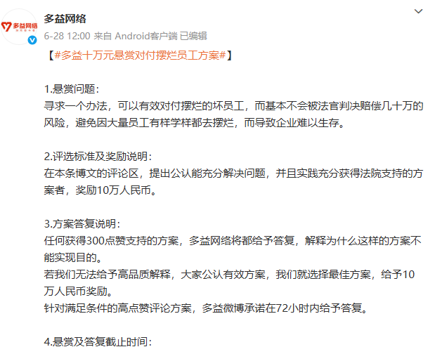 近日国内游戏厂商多益网络官方发文,称悬赏10万元用以寻求对付摆烂员工的方案。官方表示寻求一个办法:可以有效对付摆烂的坏员工,而基本不会被法官判决赔偿几十万的风险,避免因大量员工有样学样都去摆烂,而导致企业难以生存。