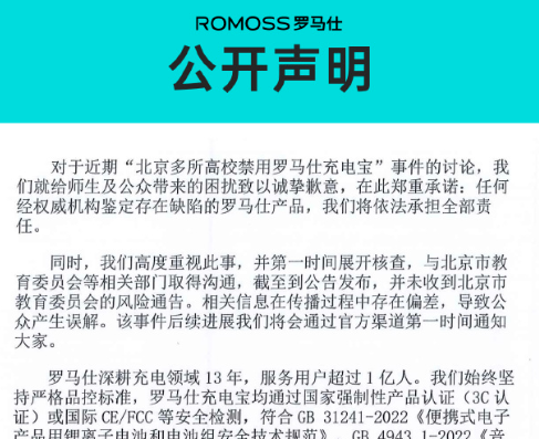 6月17日消息,据深圳市市场监督管理局消息,深圳罗马仕科技有限公司召回2023年6月5日-2024年7月31日期间制造的部分罗马仕ROMOSS牌移动电源,共计491745台。