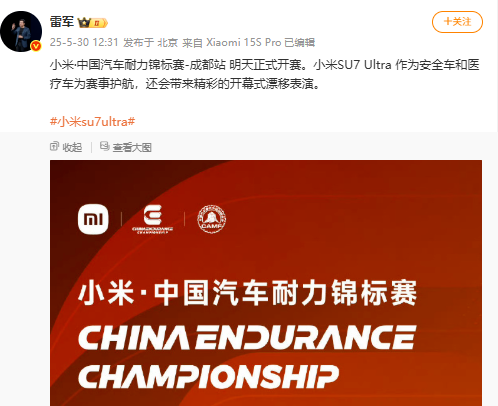 5月30日消息,今日雷军在微博发文为明天开赛的小米·中国汽车耐力锦标赛成都站预热。他透露,小米SU7 Ultra将作为安全车和医疗车为赛事护航,还会带来精彩的开幕式漂移表演。