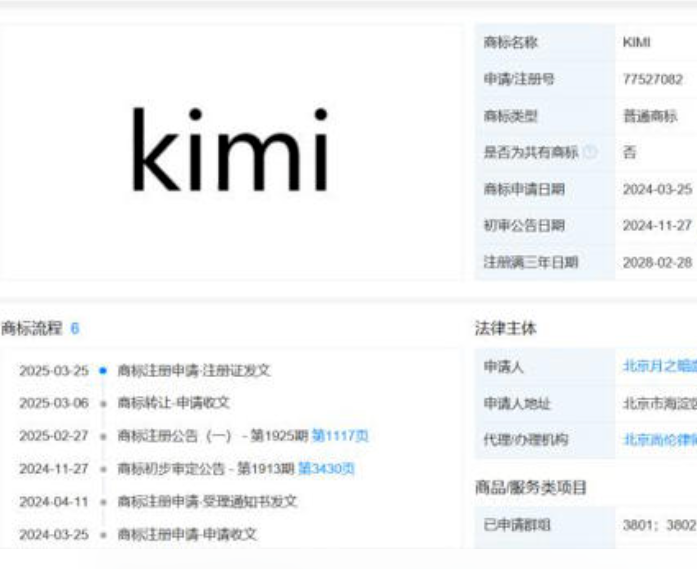 6月3日消息,据天眼查知识产权信息显示,近日,小米科技有限责任公司将多枚“kimi”商标转让至北京月之暗面科技有限公司,上述商标最早申请于2013年,当前上述商标状态多为已注册。