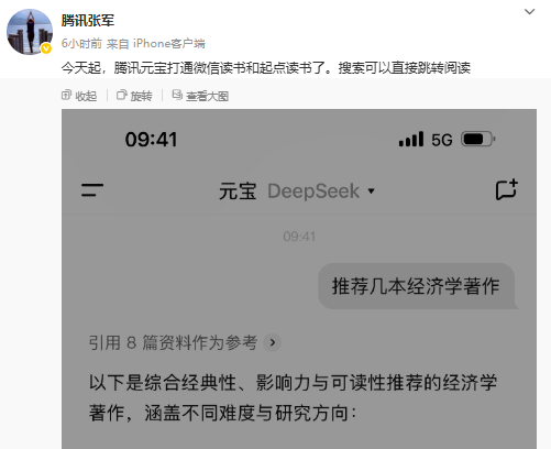 5月28日消息,腾讯公司公关总监张军在其微博上宣布腾讯元宝与微信读书、起点读书实现打通。