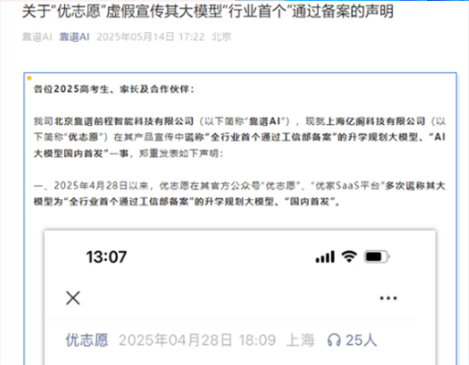 随着高考季临近,5月14日,靠谱AI在官方公众号发布声明,指出优志愿大模型存在虚假宣传的问题。