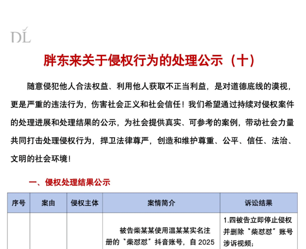 胖东来发布《关于侵权行为的处理公示(十)》,通报多起侵权案件处理结果,其中“柴怼怼”账号运营者柴某某等因商业诋毁及名誉权侵权,被判决赔偿胖东来200万元、于东来40万元及合理开支20万元,合计260万元。