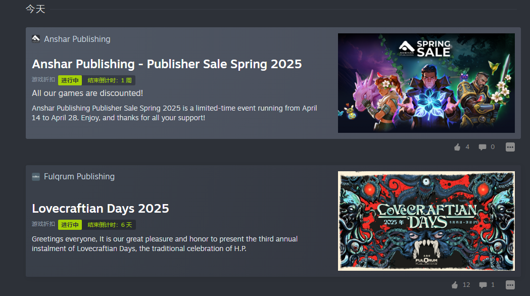 Steam平台近日已经开启第三季“克苏鲁主题周”活动,包括《渔帆暗涌》、《SKALD:攻打黑修院》、《超自然车旅》等多款“受洛夫克拉夫特启发的恐怖主题游戏”迎来折扣,计划将于4月29日结束。