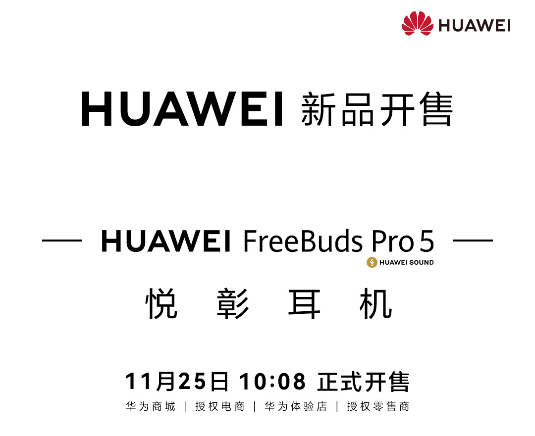 2025年11月25日,据华为官方微博报道,今日华为FreeBuds Pro5悦彰耳机今日正式开售,售价为1499元。