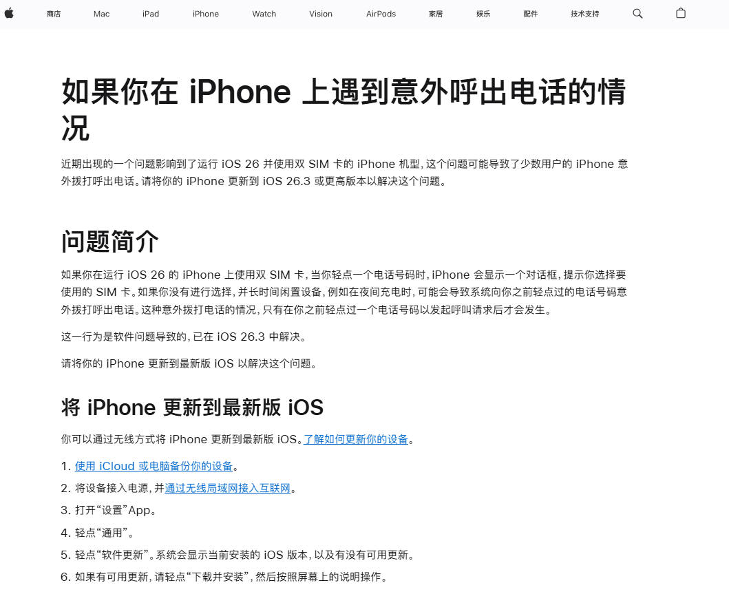 PChome 3月26日消息,苹果官网正式承认存在半夜自动拨电话的软件漏洞,明确该问题仅影响运行iOS 26且使用双SIM卡的设备,并在iOS 26.3版本中修复。