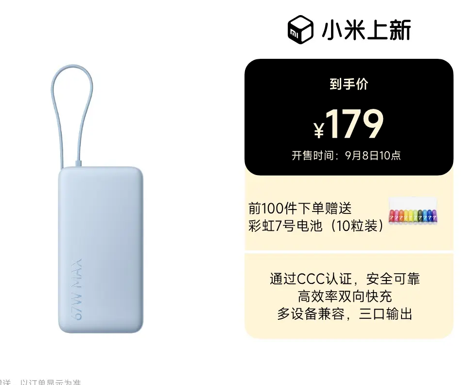 9月8日,小米自带线充电宝20000mAh 67W开启全渠道售卖,售价179元。这款新品作为老款33W机型的升级替代款,凭借高容量、快充能及多设备兼容特性,成为差旅用户续航解决方案的新选择。