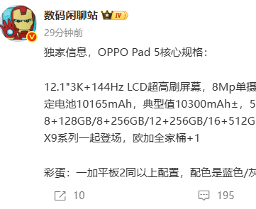 9月12日上午,知名博主数码闲聊站曝光了全新平板OPPO Pad 5的核心配置:新品搭载旗舰级天玑9400+处理器,支持67W快充,预计10月随Find X9系列一同发布。