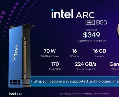 9月4日,Intel正式发布锐炫Pro B系列中的新成员——锐炫Pro B50。定位中端专业市场,售价为349美元(约2493元人民币),可单独购买,也将作为OEM整机配置的一部分供应。