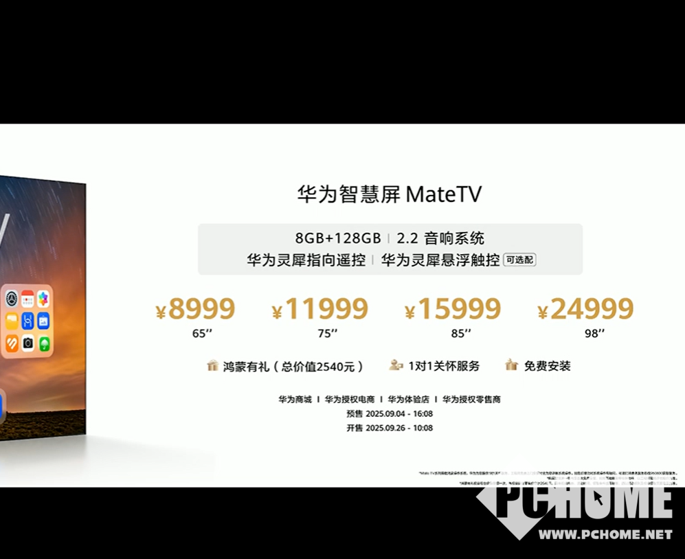 2025年9月4日举办的华为Mate XTs 非凡大师及全场景新品发布会,华为史上最大Mate,华为智慧屏MateTV,售价8999元,推出4种不同尺寸。Pro版,售价14999元起推出3种不同尺寸,现已开启预售,9月26日正式发售。