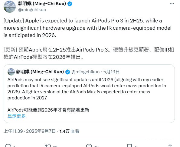 9月7日,苹果产业链分析师郭明錤发布最新预测,苹果计划于2025年下半年推出AirPods Pro3,并确认2026年将推出配备IR红外摄像头的新品。