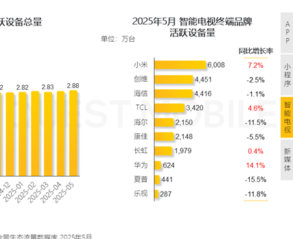 7月15日,截至目前,中国智能电视的活跃设备量在今年5月达2.8亿台。小米电视,以6008万台的活跃设备量位居榜首,同比增长7.2%。华为智慧屏虽然当前活跃设备量为624万台,但同比增长最多高达14.1%,
