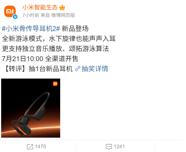 7月18日消息,小米智能生态发文称,小米骨传导耳机2正式发布,售价699元,将于7月21日10:00全渠道开售。
