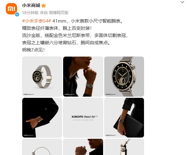 6月25日消息,小米商城官方微博发文称,小米明晚7点将发布小米首款小尺寸智能腕表——小米手表S4,表壳尺寸仅41mm。