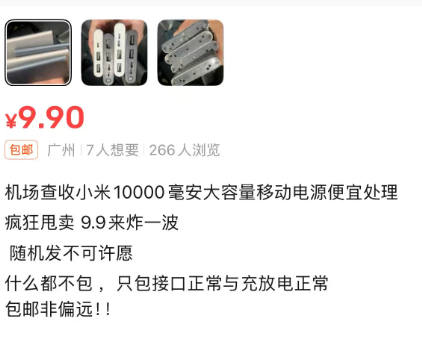 6月30日消息,根据中国民航局发布的通知,自6月28日起禁止旅客携带没有3C标识、3C标识不清晰、被召回型号或批次的充电宝乘坐境内航班。但值得注意的是,我们发现二手平台随即涌现大批号称是“机场拦截”“安检扣押”的低价充电宝。