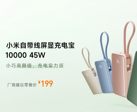7月1日消息,小米推出了一款自带线屏显充电宝10000mAh 45W,现已开售,售价199元。该充电宝拥有3C认证,可上飞机。