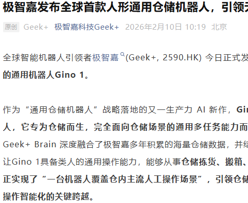 2026年2月11日消息,物流机器人企业极智嘉(Geek+)于昨日正式发布了全球首款仓储通用人形机器人Gino 1,引领仓储行业实现从移动智能化到操作智能化的关键跨越。