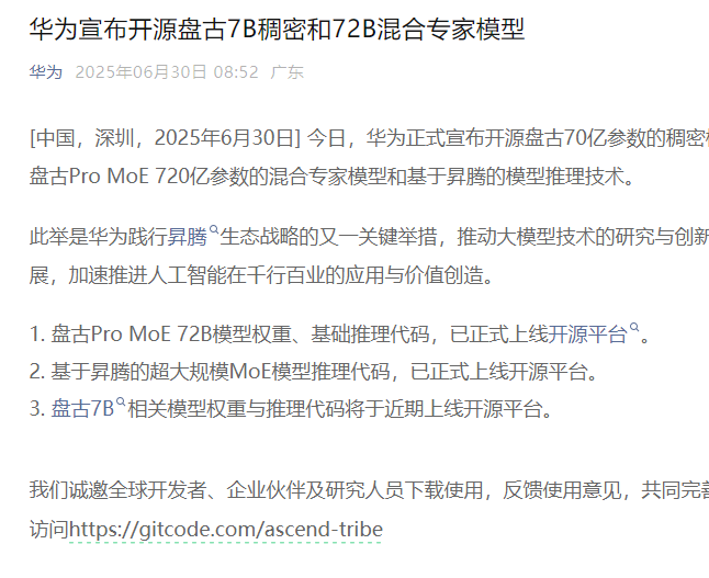 6月30日消息,华为正式宣布开源盘古70亿参数的稠密模型、盘古Pro MoE 720亿参数的混合专家模型,同时开放基于昇腾AI平台的模型推理技术。
