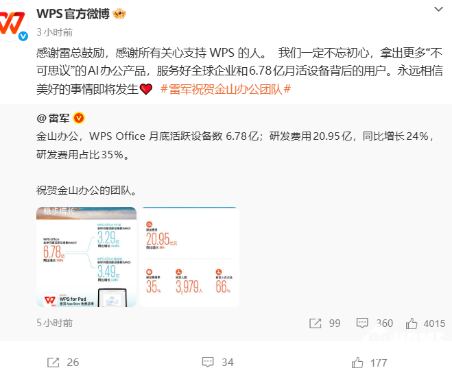 PChome 3月26日消息,今日,小米集团创始人雷军在微博发文,披露了金山办公的两项优异成绩并致以祝贺。金山办公随后转发其微博并表态将持续深耕AI办公领域,为全球用户提供更好的服务。