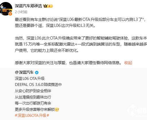 2026年2月2日,深蓝汽车董事长邓承浩在微博发布公开声明,针对近期车主群流传的“深蓝L06最新OTA升级后部分用户可内测L3自动驾驶”的消息进行明确辟谣。