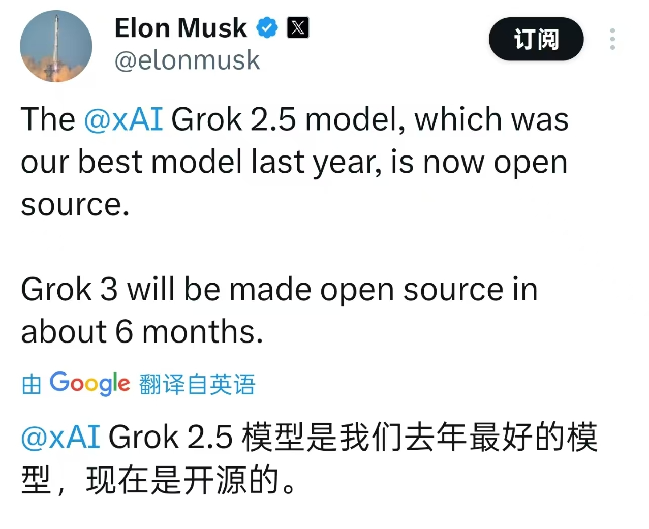 8月24日,特斯拉创始人兼CEO埃隆・马斯克在海外社交平台X上发帖表示,其旗下人工智能初创公司xAI已将Grok2.5模型开源,并计划在约六个月后开源其下一代模型Grok 3。此举被认为将为开源大模型领域注入新的活力。