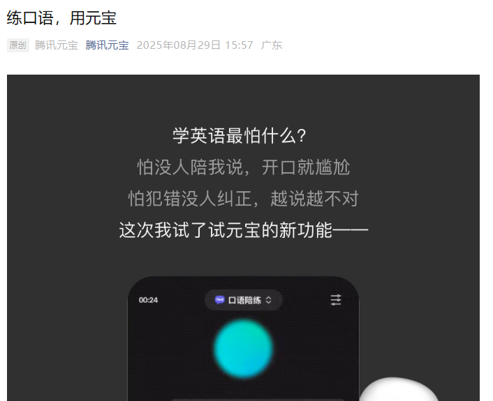 8月29日,腾讯元宝官方今日宣布上线英语口语陪练功能。很好的解决了用户在自己学英语时,没有人能够共同练习口语而导致不敢开口的尴尬现象。