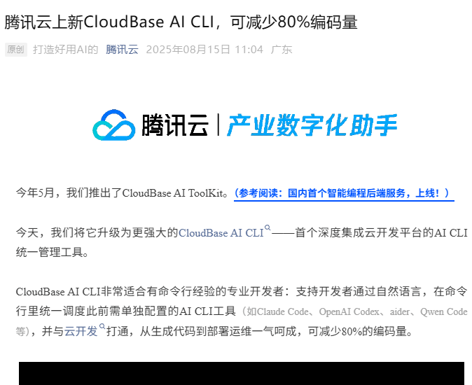 8月15日,今年5月,腾讯云推出国内首个智能编程后端服务CloudBase AI ToolKit。今日,腾讯云官方发文宣布,将其升级成CloudBase AI CLI——首个深度集成云开发平台的AI CLI统一管理工具。
