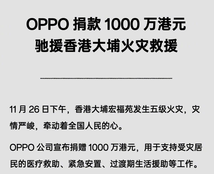 OPPO公司宣布捐赠1000万港元,用于支持受灾居民的医疗救助、紧急安置、过渡期生活援助等工作。OPPO向所有奋战在一线的消防员、救援人员,及社会爱心力量致以崇高的敬意。