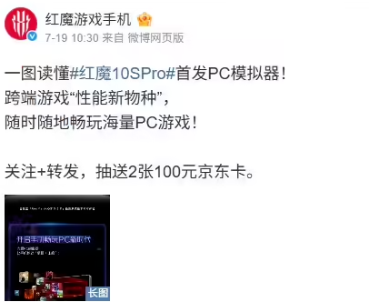 7月20日消息,红魔游戏手机官方微博发文称,红魔10S Pro系列首发上线PC模拟器,号称跨端游戏“性能新物种”。
