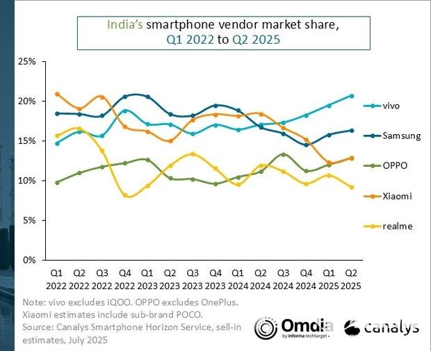 7月22日,根据市场研究机构Canalys今日发布报告,2025年第二季度印度智能手机出货量达3900万部,同比增长7%。其中vivo(不含iQOO)以810万部、21%的市场份额登顶,这也是其连续第四个季度夺冠。