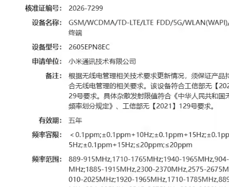 PChome 4月15日消息,今日,一款型号为2605EPN8EC的小米新机通过了工信部SRRC认证,结合此前爆料来看即为17系列大屏新机,预计将命名为小米17 Max(也有部分人称小米17S Pro)。
