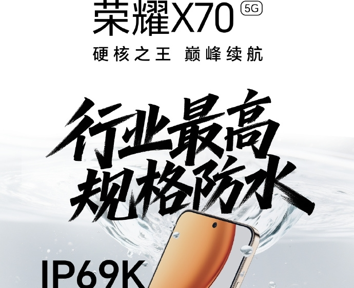 荣耀X70将防水等级提升至了前所未有的IP69K,可防泡水、喷水、高温水。并同时通过了SGS金标三防认证,十面抗摔。