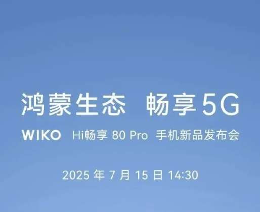 7月10日消息,WIKO将于7月15日14:30举行Hi畅享80 Pro手机新品发布会,主题为“鸿蒙生态,畅享5G”。