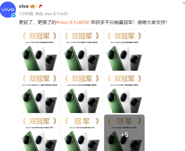7月3日,vivo官方发布了vivo X Fold5首销战报,该机斩获多平台销量冠军。