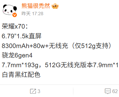 7月7日消息,多位数码博主爆料荣耀2025年下半年新品发布计划,数码博主@熊猫很禿然发文曝光了荣耀X70的部分参数。