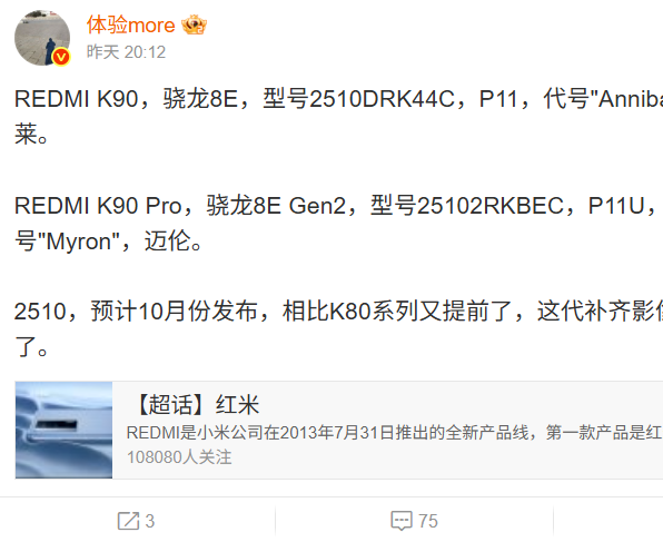 7月7日消息,昨日,数码博主@体验more曝光了REDMI K90系列的部分相关信息。