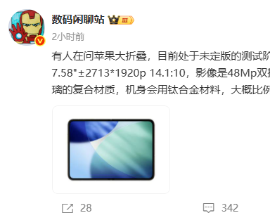 6月26日消息,博主数码闲聊站爆料,苹果首款折叠屏目前尚未定版,其屏幕尺寸是7.58英寸,分辨率为2713×1920,屏幕纵横比为14.1:10,后置4800万双摄,配备非晶态金属玻璃铰链,机身使用钛合金材料。