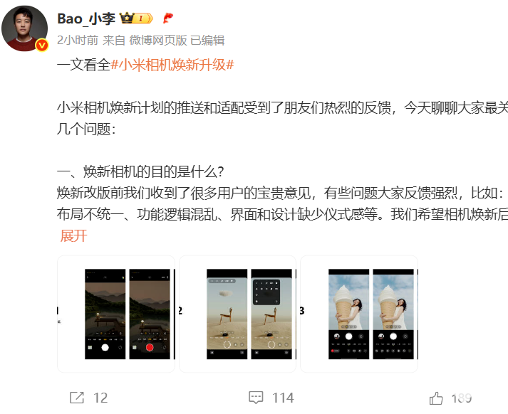 6月30日消息,小米手机相机部产品经理@Bao_小李讲解了小米相机焕新升级计划。其中包括焕新相机的目的是什么、焕新计划涵盖的机型、新功能下沉以及对应机型、焕新功能UI界面的诞生历程等。