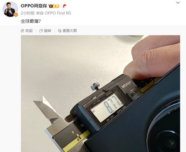 7月2日,OPPO Find系列产品负责人周意保在社交媒体发文,实测了OPPO Find N5厚度是8.77毫米,为全球最薄。在OPPO的官网上显示的OPPO Find N5折叠后厚度为8.93mm。周意保发布的实测数据比官网给的数据还要更薄