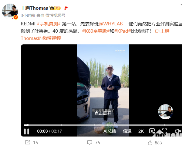 7月3日,王腾在社交媒体上发布了前往吐鲁番的交河故城里探班REDMI夏测基地的视频。在测试现场,测试人员测试REDMI K80至尊版和友商手机在高温环境下的游戏表现。REDMI K80至尊版在火焰山的游戏表现将在本周揭晓