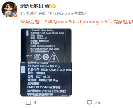 2025年11月17日,博主“熠熠玩数码”分享了华为Mate 80 Pro系列包装盒,包装盒信息显示,Mate 80 Pro提供12GB和16GB运存版本,对应不同处理器配置:12GB版本(型号SGT-AL50)搭载麒麟9030,16GB版本(型号SGT-AL00)则升级为麒麟9030 Pro。据爆料,麒麟9030系列工艺在核心架构与性能上会有进一步提升,因此成为了全网热议的焦点话题。
