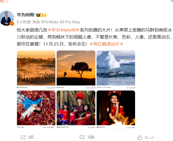 2025年11月19日,华为终端BG首席执行官何刚在微博发图公布了华为Mate 80系列手机拍摄的照片样张,涵盖Mate 80 Pro、Mate 80 Pro Max、Mate 80 RS非凡大师三款机型。